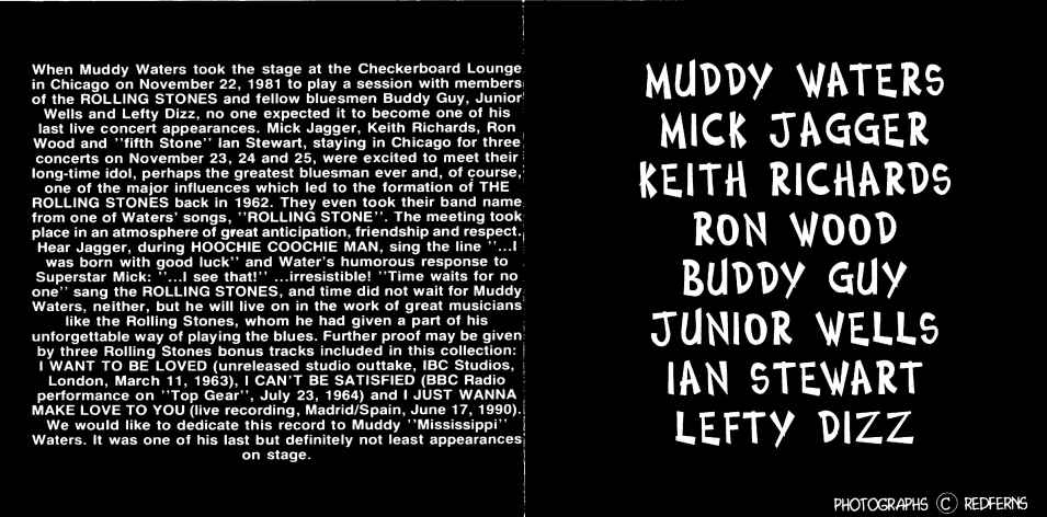 Muddy Waters, Buddy Guy, Junior Wells, Rolling Stones @ Buddy Guy's Checkboard Lounge, Chicago, 22 Nov. 1981. Disc 2, track 8: unreleased studio outtake, IBC Studios, London, March 11, '63; track 9: BBC Radio performance, 7/2364; track 10: Madrid 6/17/64