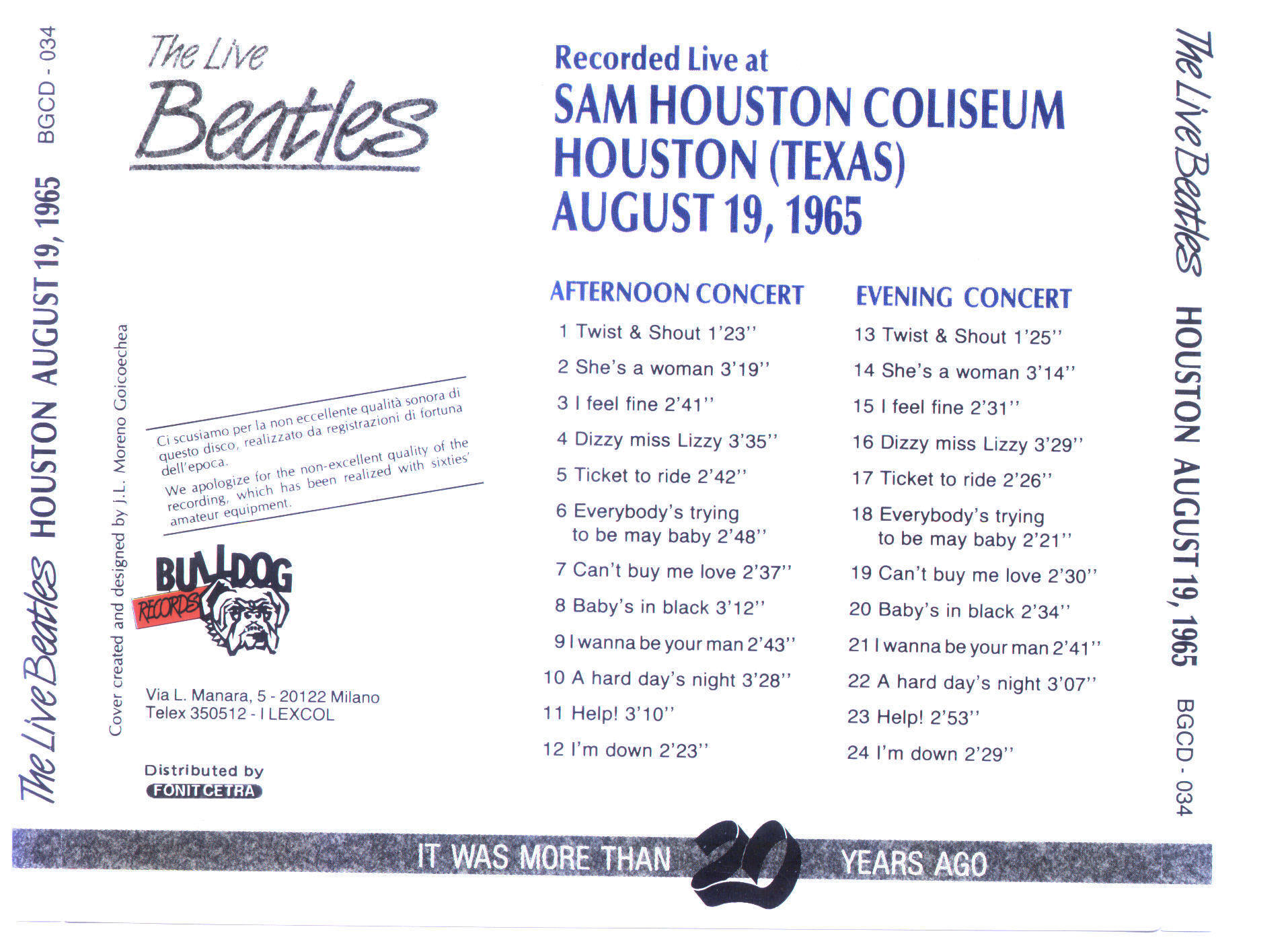 | The Live Beatles | 19 Aug 1965 | 1 | Sam Houston Colliseum | Houston | TX | USA |